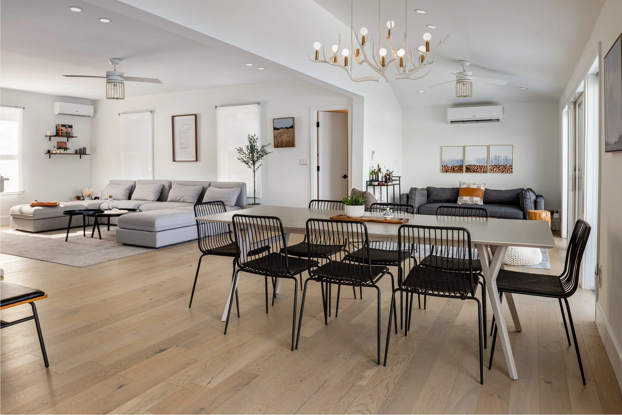 Gather in the spacious open-concept living room with a cozy wrap-around sofa and breathtaking lake views. Watch a sunset or have a movie night in serene surroundings. -