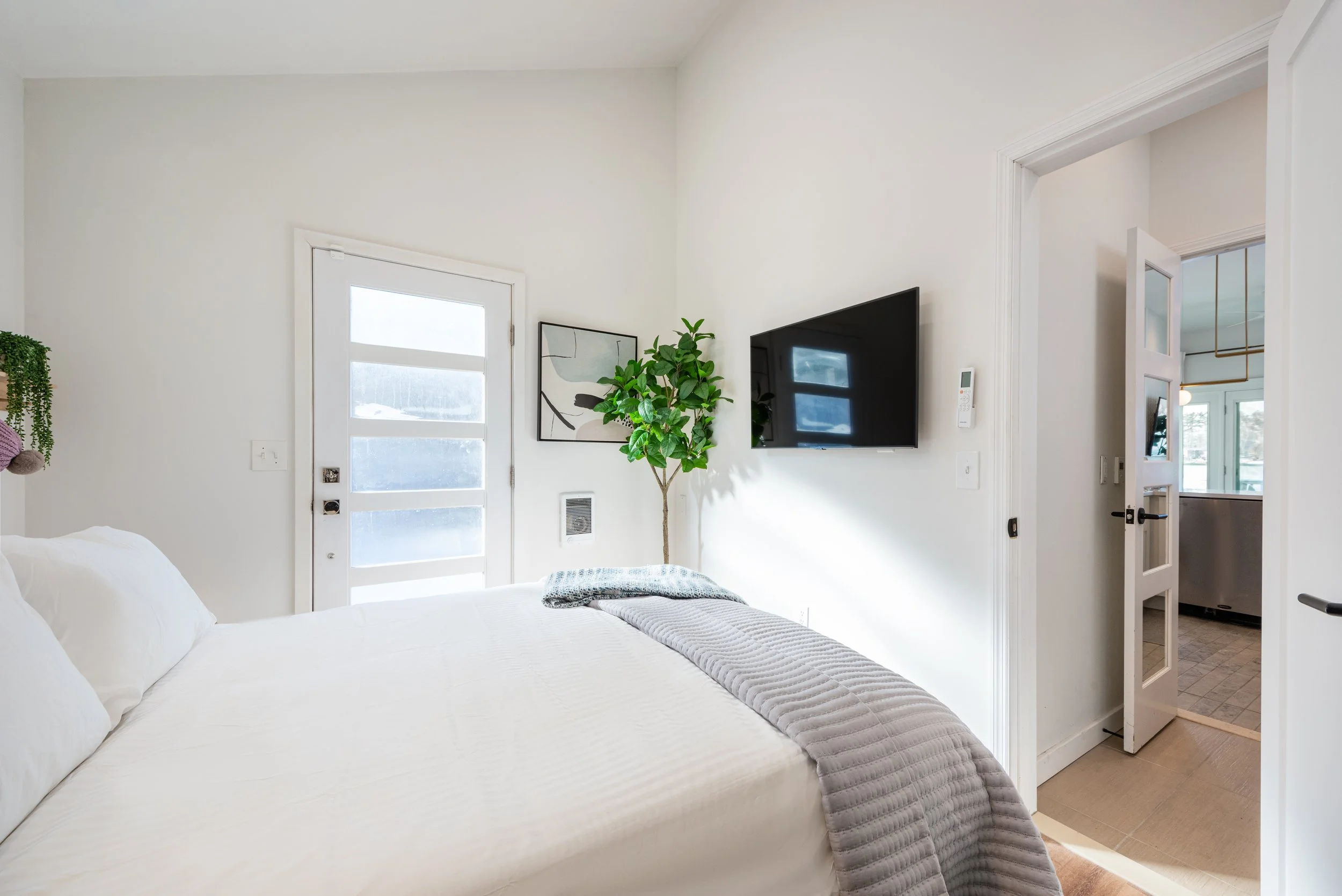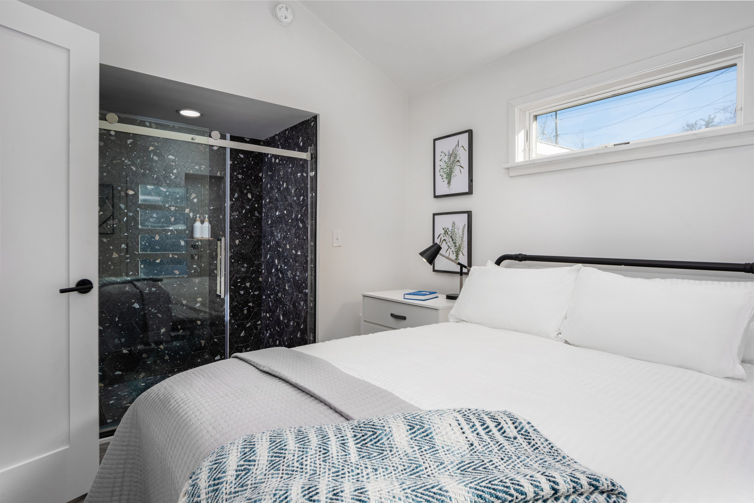 Each bedroom has a full shower, ensuring a comfortable stay for all guests. The master bedroom, located on the second floor, features a king bed and a private balcony that provides breathtaking lake views, while the first-floor bedroom offers an in-room shower and private entrance for added convenience.